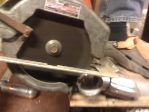 A little circular saw abuse – followed by much cursing and futzing and hollowing out the apparently mis-forged piece so that it actually *fits* over 1.5-inch pipe – and the piece now fits snugly between the stringer ends …