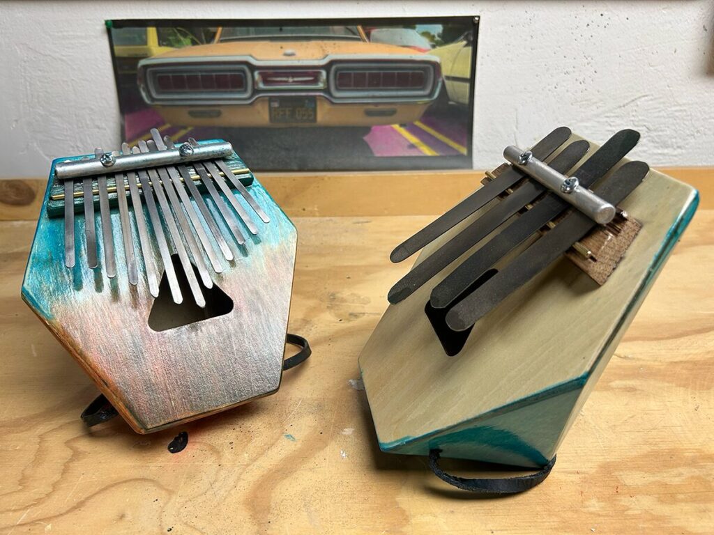 In the end, though, they did come out shaped as designed. The pale one with the big keys is an experimental bass kalimba, and the turquoise/rust one is proof that I have a lot left to learn about finishing. I fitted them with jacks wired to piezo pickups, which makes them sound rather hellish through an amp – a little like Congotronics, only kind of awful.
