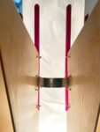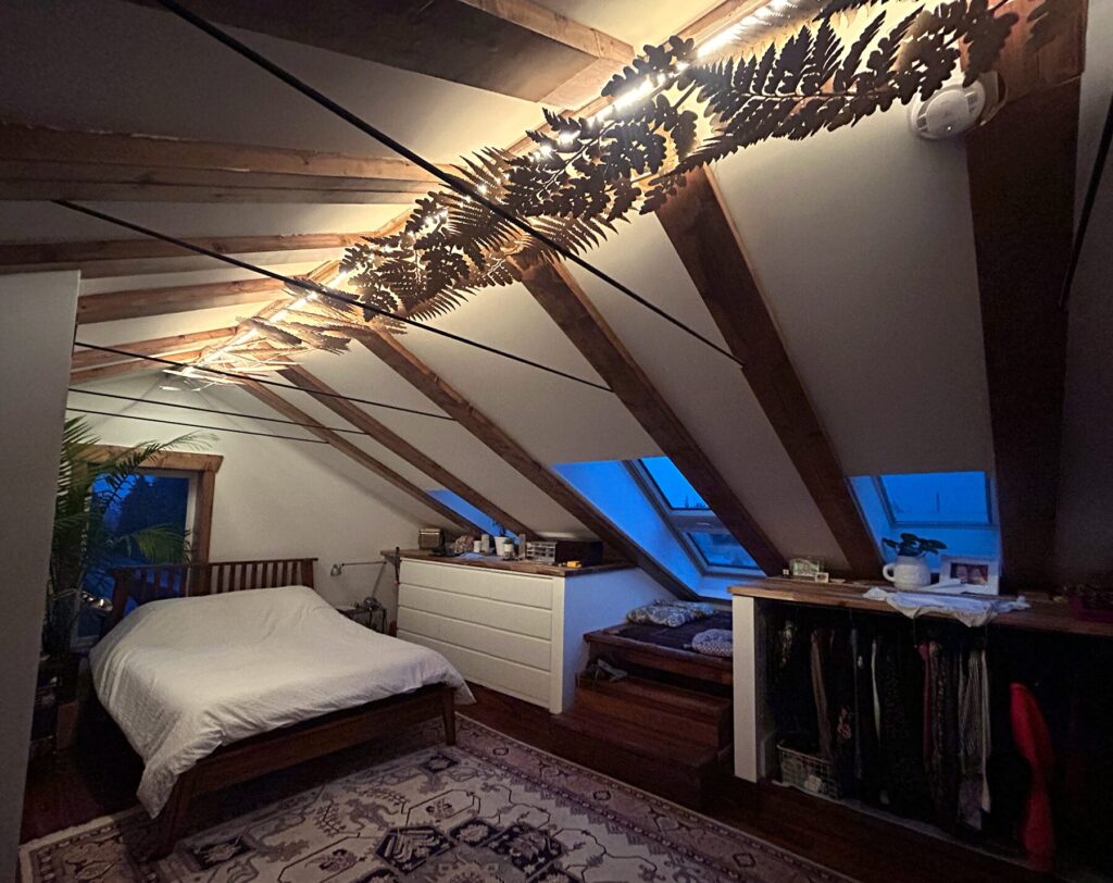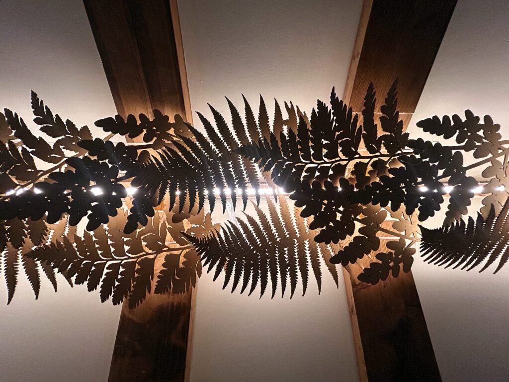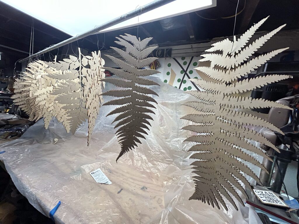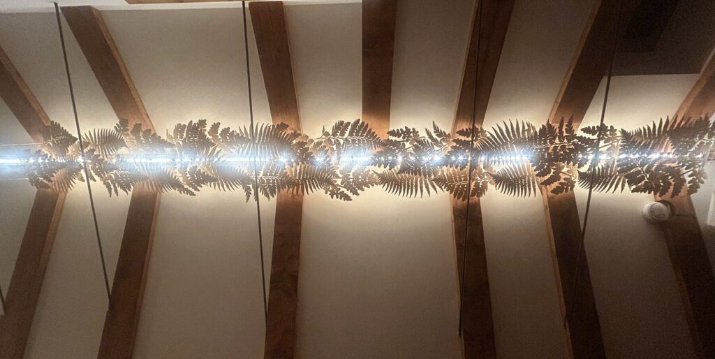 The ferns are each about 18″ long, laser-cut, clear-coated, and hung with zinc wire from steel rails that I suspended from the rafters on straps of plumber’s tape. I painted the metal white to help it disappear and blend in.
